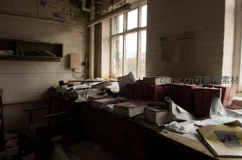 废弃办公室书桌堆满旧书,阳光穿透尘埃