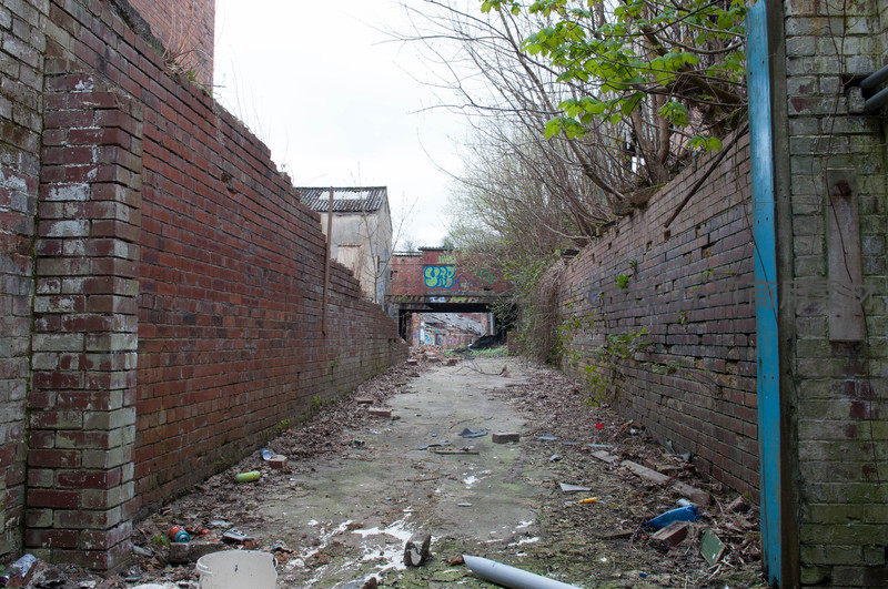 一条狭窄的废弃小巷,两侧高耸的红砖墙布满岁月痕迹,墙角长满野草。远处可见一座桥洞,上面喷绘着彩色涂鸦,整个场景充满衰败与生机并存的独特美感。