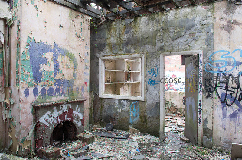 破败房间角落,壁炉残骸与涂鸦墙