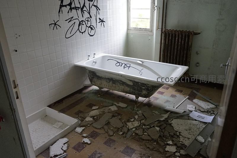 一间荒废的浴室,白色浴缸上布满黑色涂鸦,地面铺满破碎的瓷砖和瓦砾,墙砖剥落,整体呈现出被时间遗忘的颓败景象。