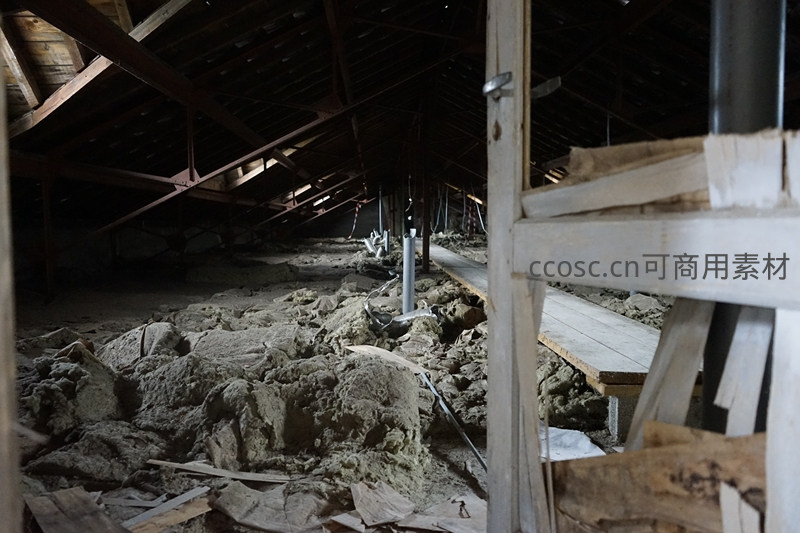 一座废弃建筑的阁楼内部,堆积着大量陈旧的棉絮和木板,木质横梁裸露,空间昏暗,充满了岁月侵蚀和被遗忘的痕迹。