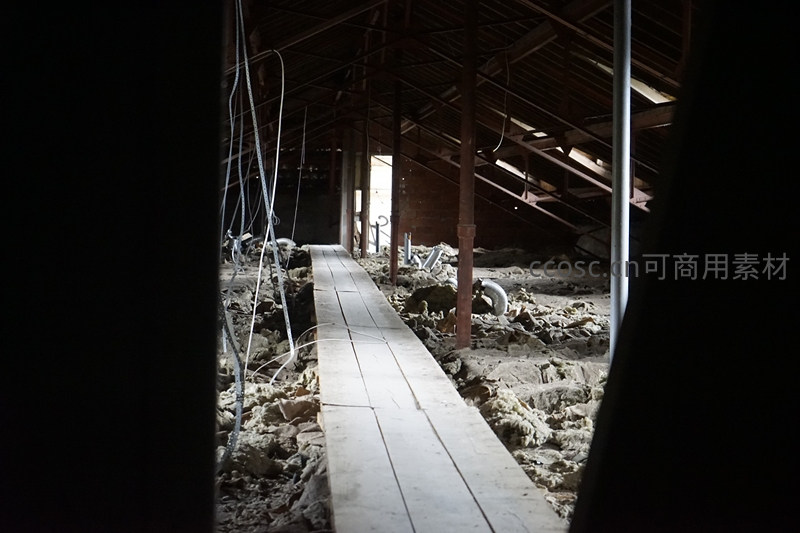 透过黑暗的门框,望向一间废弃的阁楼。满地是厚厚的灰尘和杂物,一条窄窄的木板路蜿蜒向前,通向远处的光亮。裸露的梁柱和杂乱的管道,勾勒出工业时代建筑的骨架与衰败。