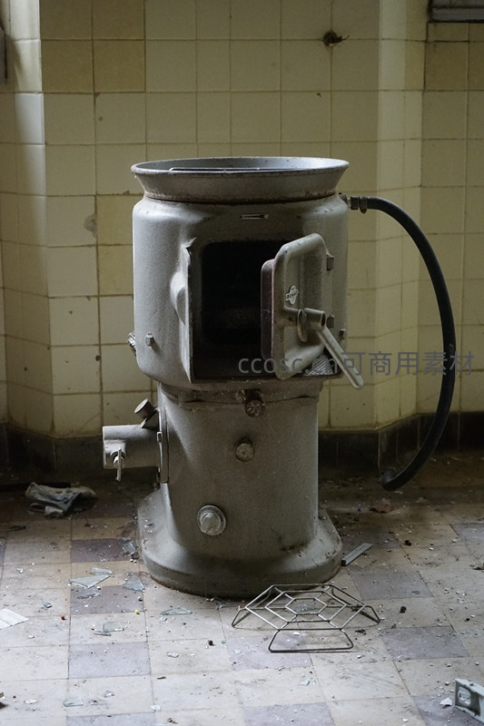 一台孤立的废弃工业粉碎机静置于破旧瓷砖地面上,机身布满灰尘和锈迹,进料口敞开,旁边散落着金属网架,充满荒凉感。