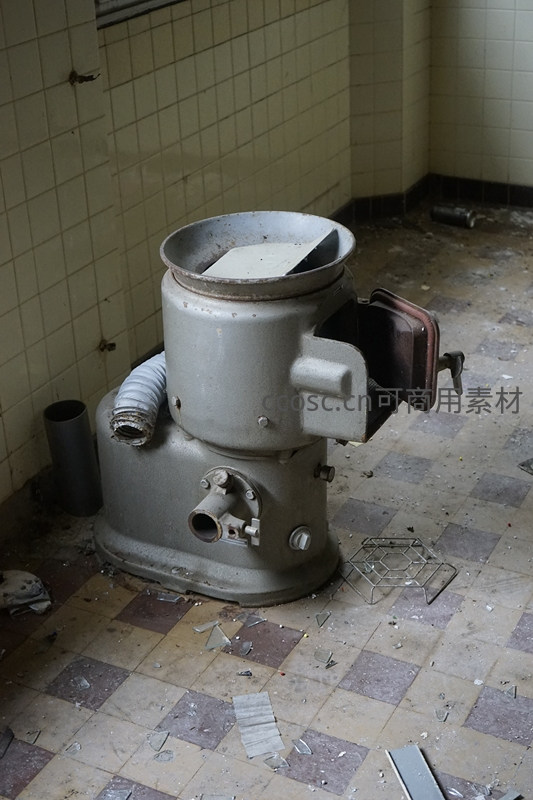 一台布满灰尘的旧式工业粉碎机静置在废弃厂房的角落,周围散落着碎玻璃和杂物,墙砖斑驳,地面污迹斑斑,诉说着被遗忘的工业时代。