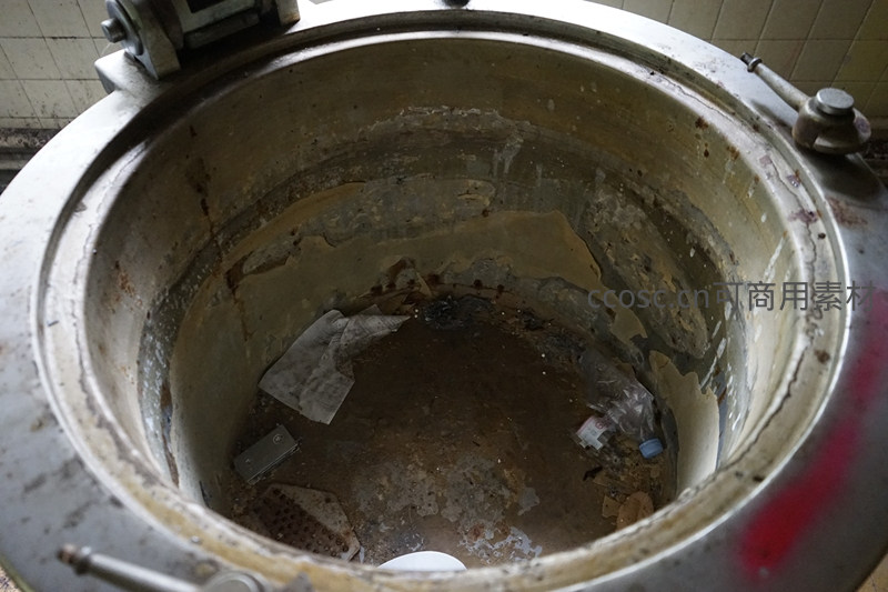 一个大型工业搅拌桶内部堆满塑料瓶、纸片等废弃物,内壁涂层剥落,锈迹蔓延,周围环境杂乱,生动呈现了工厂停产后的衰败与无人问津。