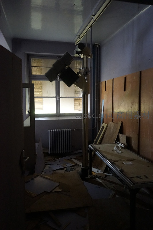 一间被遗忘的实验室内,专业设备歪斜倒地,地上堆满纸板与残骸,仅靠窗外透入的微光,映衬出一片沉寂与荒芜。