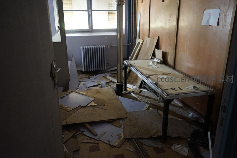 一间被遗弃的教室内部,地板上散落着破碎的木板和纸张,一张金属桌歪斜着,墙角堆着杂物,窗外透进微弱的光,整个空间弥漫着荒凉与衰败的气息。