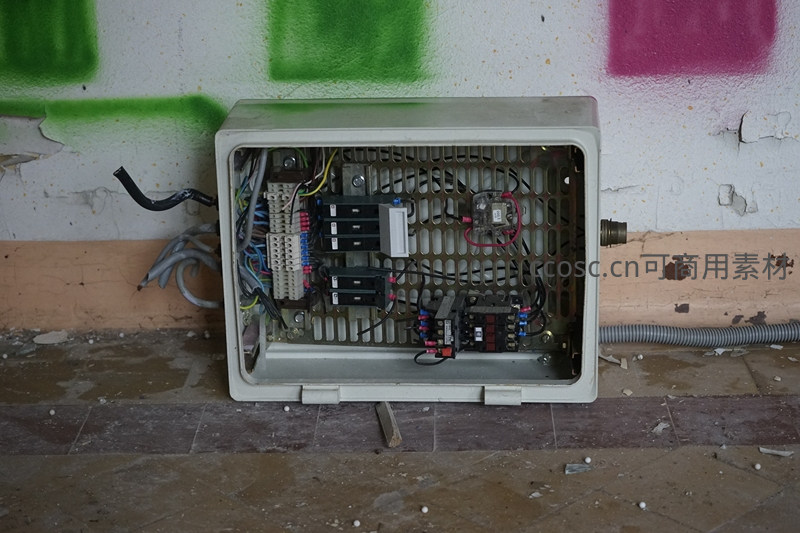 一个敞开的旧式配电箱,内部布满杂乱的电线和元器件,背景是斑驳的墙面与涂鸦,展现了工业设施老化后的状态。