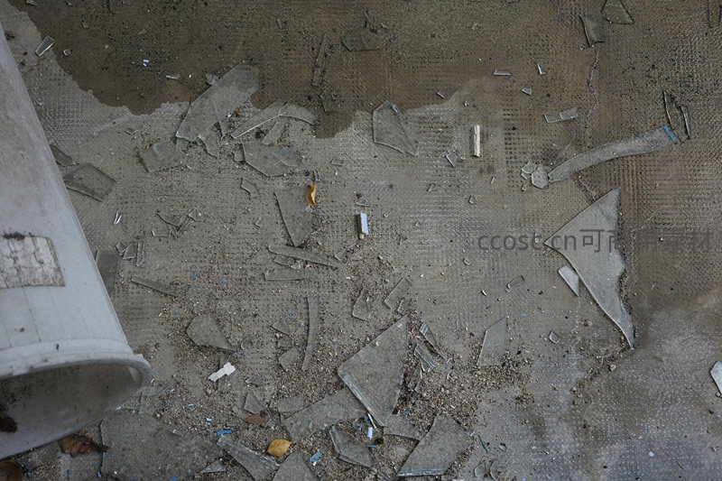 俯视视角下的废弃地面,散落着大量破碎的玻璃片、混凝土块和尘土,角落可见倾倒的桶,整体氛围荒凉而凌乱。