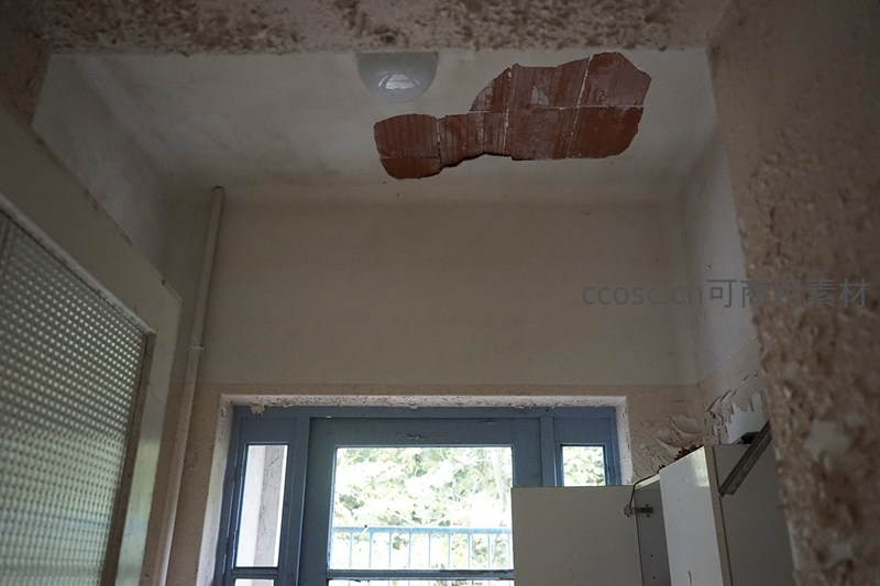 天花板破损露砖的废弃房间仰拍