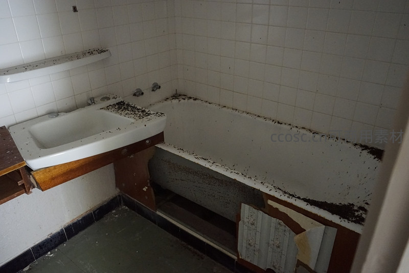 一间被彻底遗弃的浴室,白色瓷砖墙面和浴缸、洗手池上覆盖着厚厚的黑色污垢和灰尘,木质柜体破损,整个空间弥漫着衰败的气息。