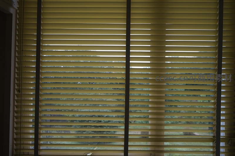 百叶窗光影交错,窗外绿意若隐若现