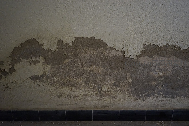 墙面下半部分因长期受潮导致腻子层大面积起泡、脱落,露出粗糙的灰色底层,边缘参差不齐,地面散落着剥落的碎屑。
