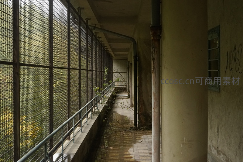 一条空旷的废弃走廊,一侧是高大的铁丝网,另一侧是斑驳的墙体和立柱。地面湿滑,野草从缝隙中生长,阳光透过网格洒下,充满末世感。