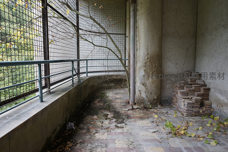 废弃阳台的枯枝与砖块,时光静止的角落