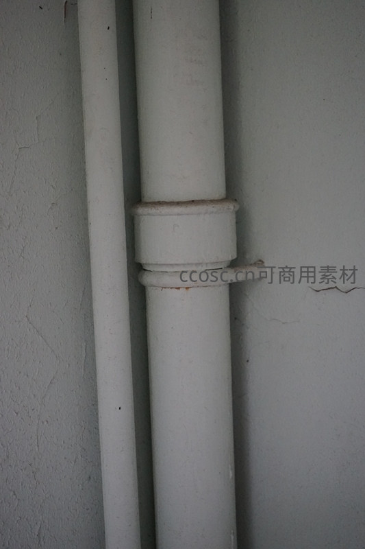 一根白色的PVC管道紧贴着布满细小裂纹的灰白色墙壁,管道接口处有轻微锈迹,展现了建筑设施的老化与日常磨损。