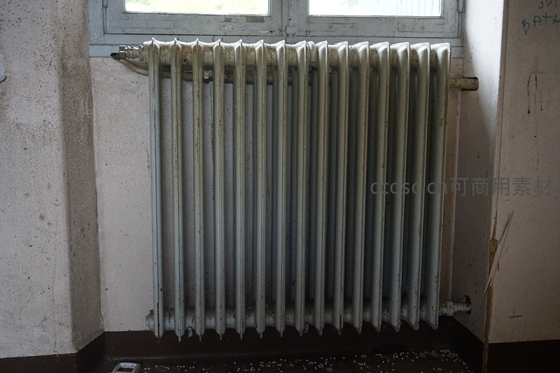 老旧铸铁暖气片在斑驳墙边
