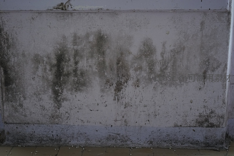 一面被大面积霉菌和污渍侵蚀的白色墙面,底部墙皮严重脱落,地面散落碎屑,显示出长期无人维护的潮湿环境造成的破坏。