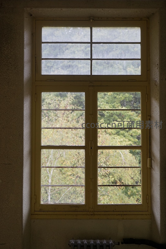 一扇带有竖条分隔的老式木窗,透过玻璃望向窗外茂密的绿色树林,阳光洒在窗框上,室内略显昏暗,营造出静谧而富有诗意的内外对比景象。