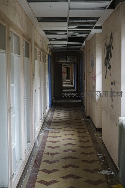 一条漫长而幽深的废弃走廊,两侧是紧闭的房门和墙上的涂鸦,头顶天花板破损,地砖图案延伸至远方,弥漫着浓重的衰败气息。