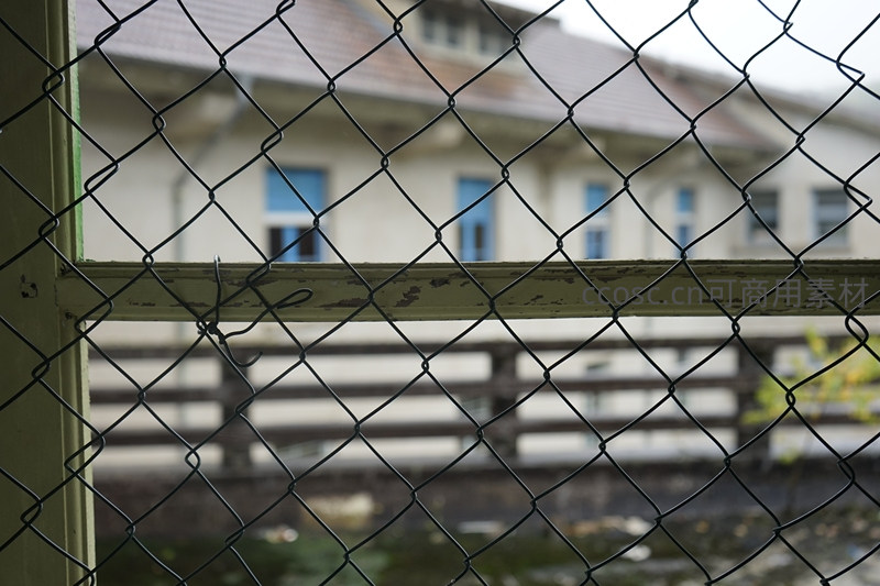 透过生锈的铁丝网栅栏,远处的老式建筑轮廓变得模糊不清,网格结构在前景形成视觉阻隔,强化了空间距离与被隔离的疏离感。