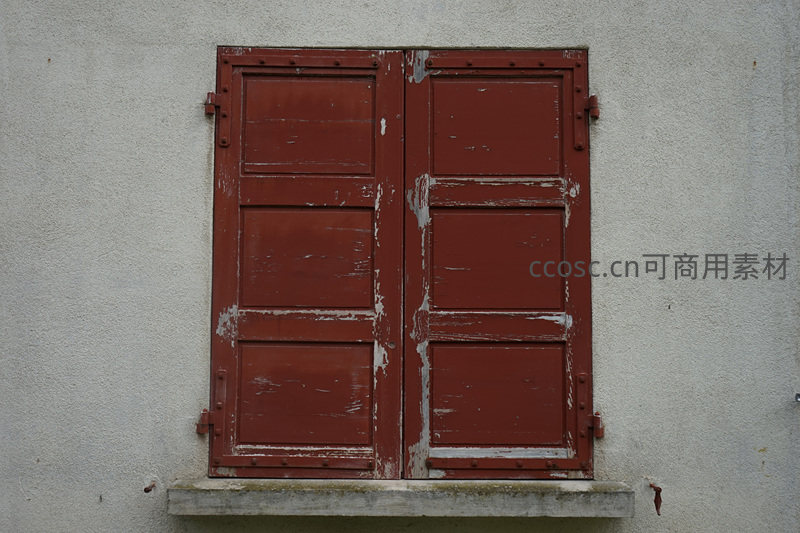 一扇饱经风霜的红色木质百叶窗紧闭着,漆面剥落露出底色,镶嵌在素净的灰白色墙面上,营造出一种宁静而略带忧郁的复古氛围。