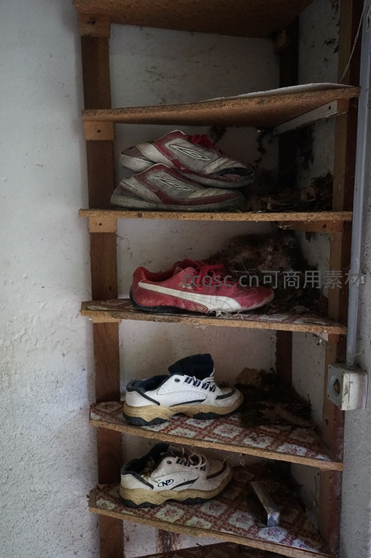 一个布满灰尘的简易木制鞋架,上面摆放着几双被遗忘的旧运动鞋,鞋间和架子上堆积着干枯的落叶,诉说着空间长久的无人问津。