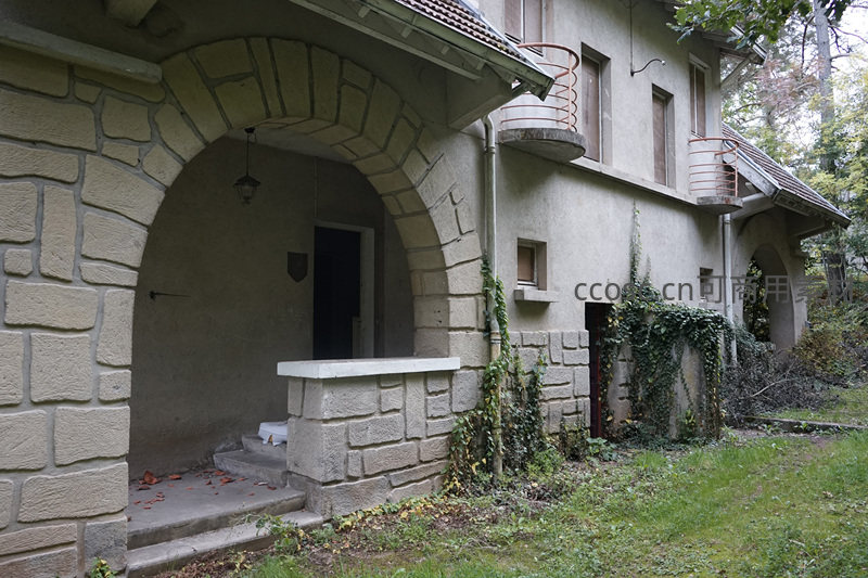 一栋带有石砌拱廊和阳台的欧式风格别墅,门前台阶整洁,但墙角已爬满藤蔓,显示出建筑虽有年代感却依然坚固,充满历史韵味。