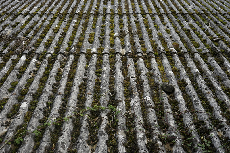 青苔覆盖的瓦片屋顶细节特写