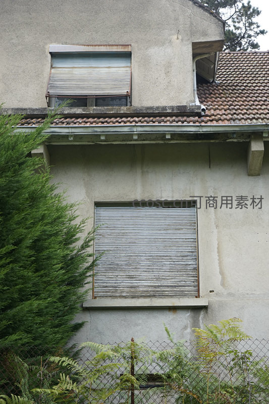一栋外墙斑驳的老房子,配以金属卷帘窗和屋檐下的排水管,周围绿植环绕,营造出宁静而略带荒凉的氛围。
