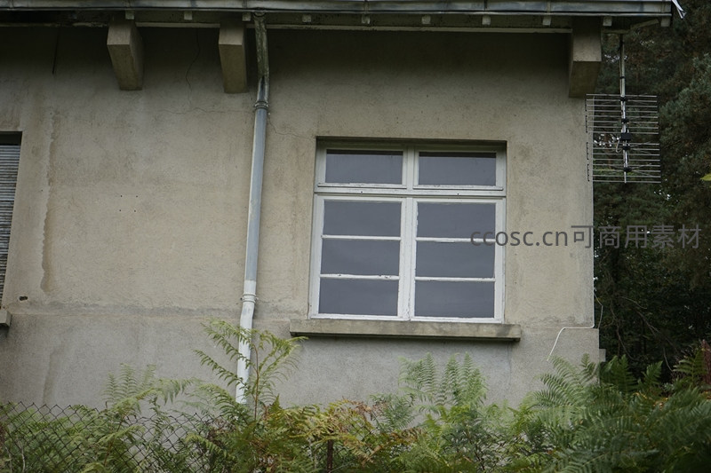 一扇带有白色窗框的玻璃窗嵌在粗糙的水泥墙上,旁边是排水管和电视天线,下方蕨类植物繁茂,展现质朴的生活气息。