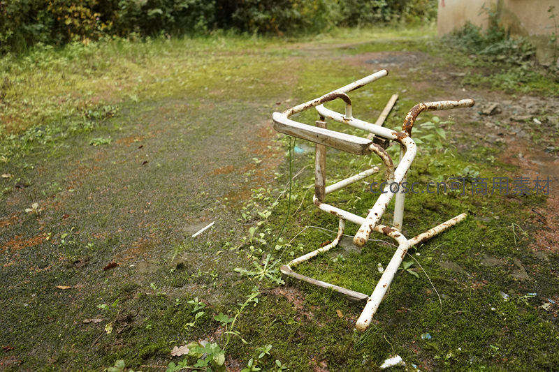 锈蚀金属架静卧青苔地,荒芜感扑面而来