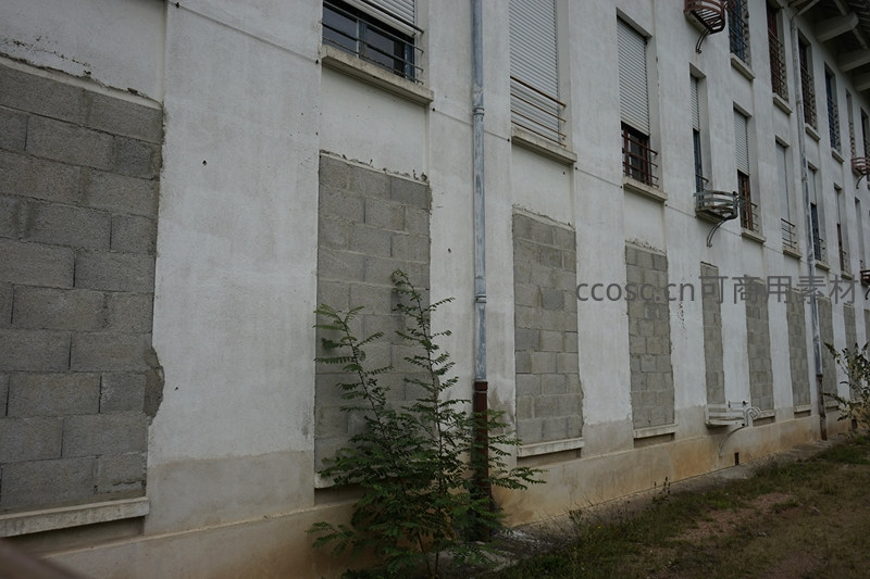 一栋老旧工业建筑的侧面,部分墙面用灰色砖块修补,墙角长出一株小树,显露出建筑年久失修、略带荒凉的工业美感。