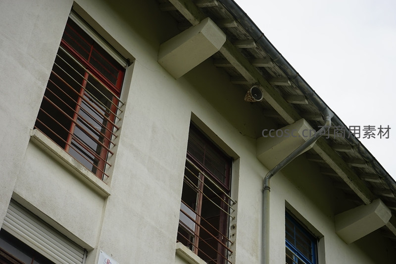一栋浅色建筑的局部特写,红色窗格搭配金属栏杆,屋檐下安装着监控摄像头,展现了现代安防设施与传统建筑风格的结合。