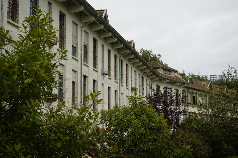 从斜角仰拍的建筑群,白色墙体与彩色窗框错落有致,前景绿叶繁茂,背景天空灰白,营造出空间层次与生态美感。