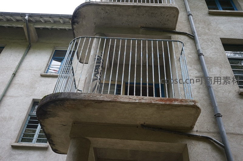 一张从低角度拍摄的老旧建筑阳台特写,混凝土结构已显斑驳,金属栏杆锈迹斑斑,展现了岁月侵蚀下的工业美学与怀旧氛围。