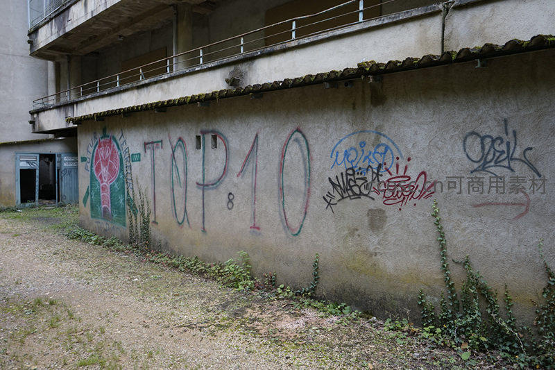一栋废弃建筑的外墙上布满了色彩斑斓的涂鸦,其中“TOP 10”字样尤为醒目,墙角爬满了绿色的藤蔓,为这片废墟增添了一丝生机与艺术气息。