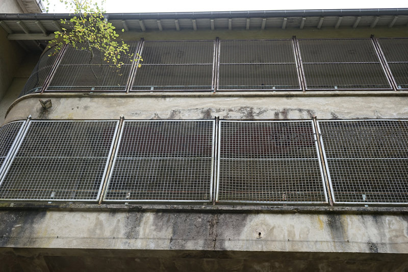 聚焦于一栋老旧建筑的外立面,整齐排列的金属网格窗与下方粗糙、污渍斑驳的混凝土墙体形成鲜明对比,一旁伸出的嫩绿枝叶为这片灰色空间注入了一丝生机。