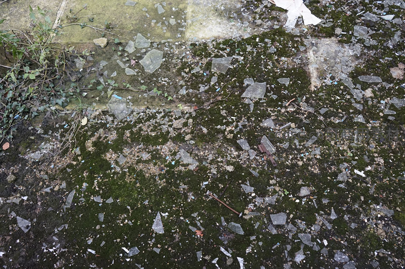 一段被青苔和碎玻璃完全覆盖的水泥台阶边缘,杂草从缝隙中顽强生长,整个画面呈现出一种被自然重新占领的荒芜感,充满了时光流逝后的静谧与破败。