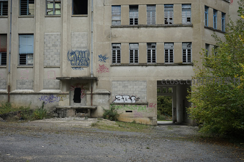 一栋多层的老旧建筑外墙布满各色涂鸦,破损的窗户和空荡的门廊诉说着它被遗弃的过往和岁月的痕迹。