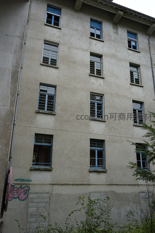 建筑外立面呈垂直构图,米黄色墙面搭配蓝色窗框,部分窗扇破损,底部有绿植攀爬,展现城市角落的日常与衰败交织。