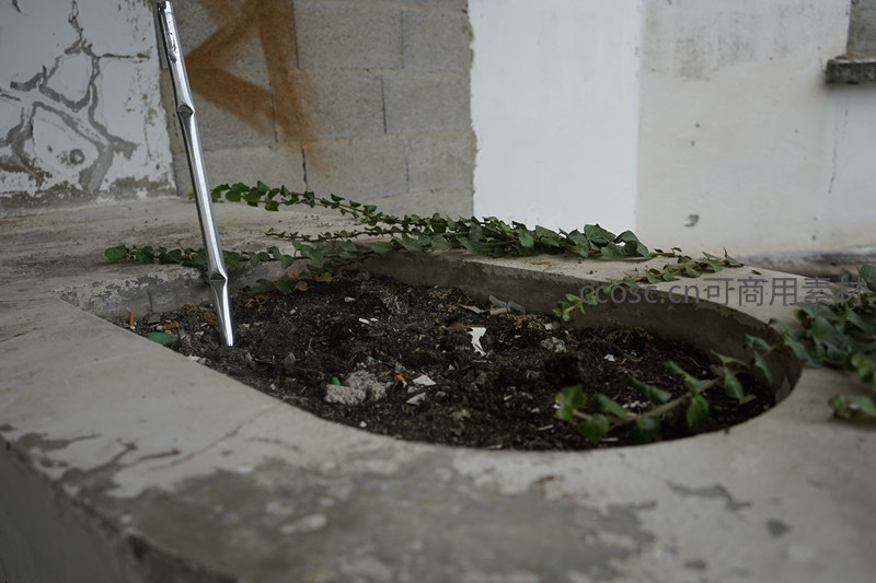 一个被遗弃的椭圆形水泥花坛,土壤裸露,几株顽强的藤蔓攀爬其上,一根金属杆斜插其中,展现了自然力量在城市废墟中的悄然复苏。