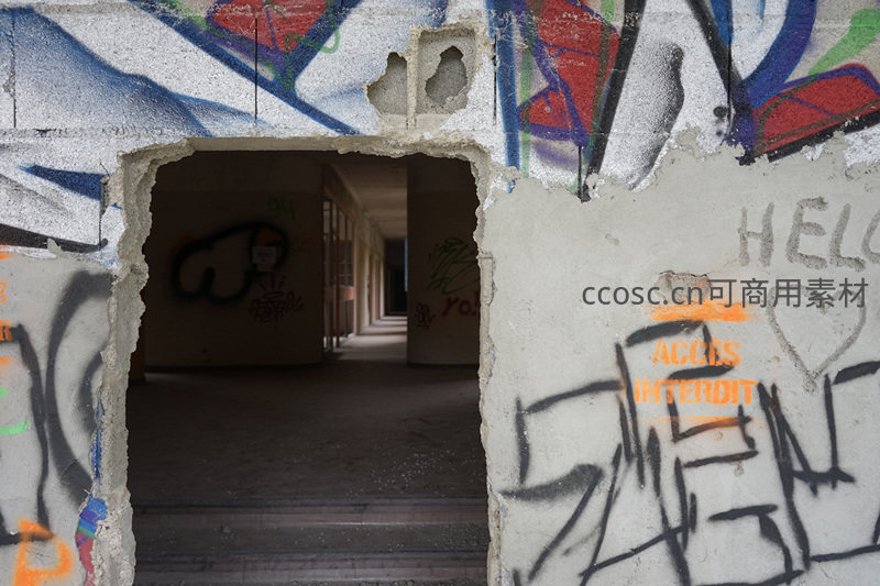 废弃建筑的涂鸦走廊,破墙洞开显荒凉