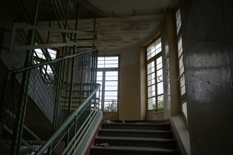一个昏暗的废弃楼梯间,绿色铁网护栏锈迹斑斑,楼梯台阶磨损严重,透过高大的窗户洒入微弱光线,墙上留有模糊字迹,营造出神秘而寂静的氛围。