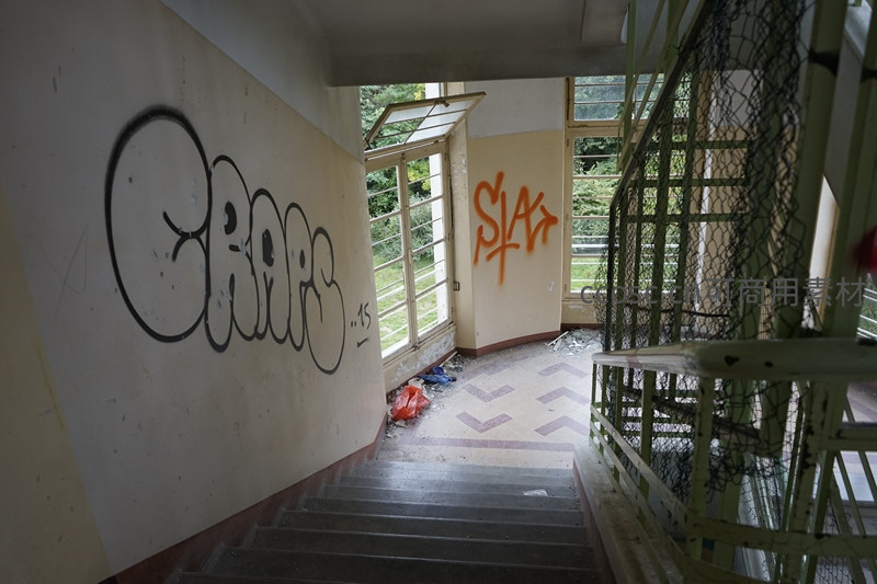 楼梯拐角处的墙壁上喷绘着醒目的黑色和橙色涂鸦,窗外绿意盎然,阳光斜照进来,与室内的破败形成鲜明对比,展现街头艺术在废墟中的生命力。