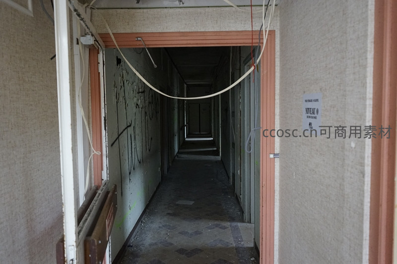 一条幽深狭长的废弃走廊,墙壁斑驳,悬挂着凌乱的电线,远处尽头黑暗不明,墙上贴有“NIVEAU 0”标识,地面铺着菱形地砖,弥漫着神秘与孤寂感。