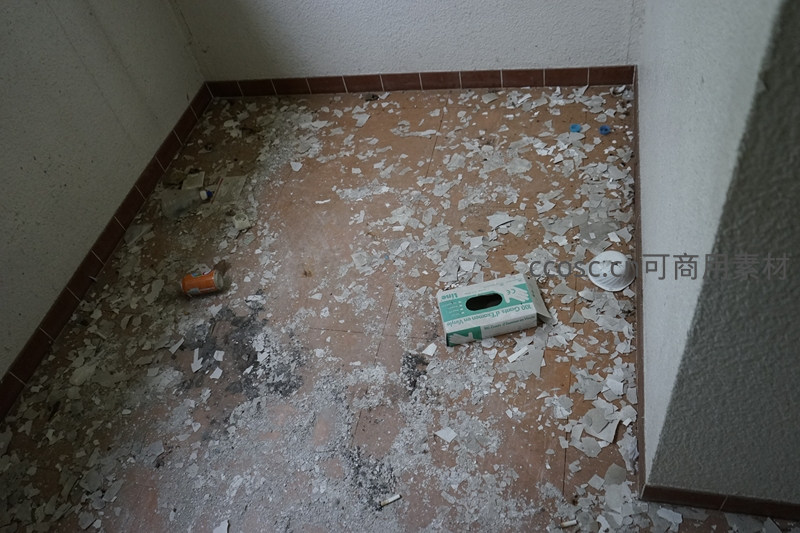 一间废弃房间的地面铺满了从天花板剥落的白色石膏板碎片、烟头和空罐子,棕色瓷砖地砖上覆盖着厚厚的灰尘,显得杂乱无章且无人问津。