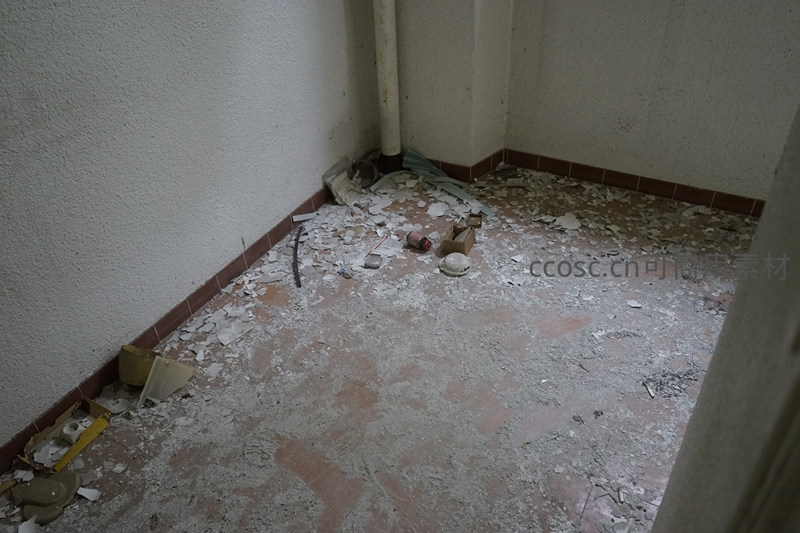 一个空旷的废弃房间角落,墙边堆积着各种施工或丢弃的杂物,包括纸箱、工具和大量白色碎屑,墙壁斑驳,整个空间弥漫着被遗忘的气息。