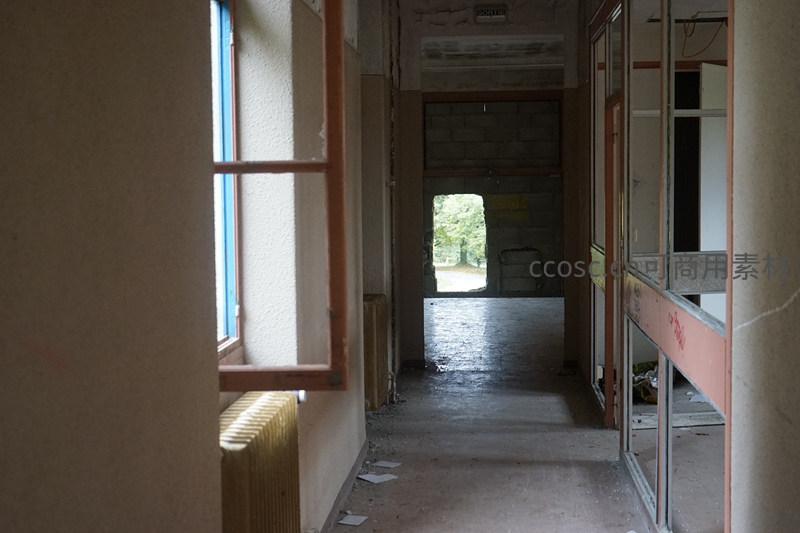一条狭长的废弃走廊,两侧是破旧的门窗和剥落的墙皮,尽头的门洞外透进明亮的自然光,形成强烈的明暗对比,营造出神秘而寂寥的氛围。