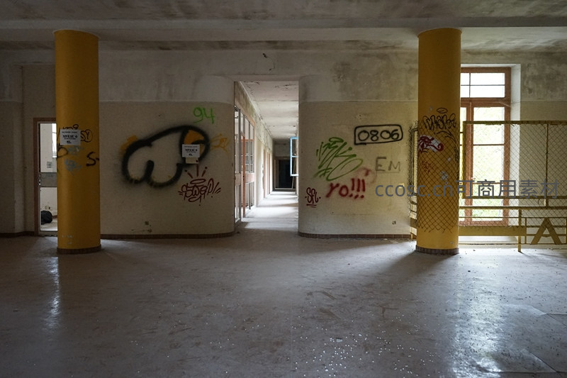 两根黄色立柱之间,是一条通往更深处的废弃走廊,两侧墙壁上覆盖着涂鸦,一扇带铁丝网的窗户透进天光,整个场景弥漫着工业废墟的冷峻美感。